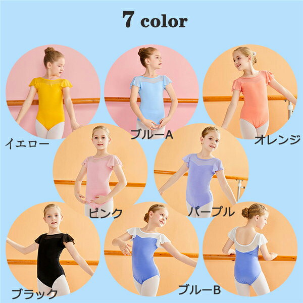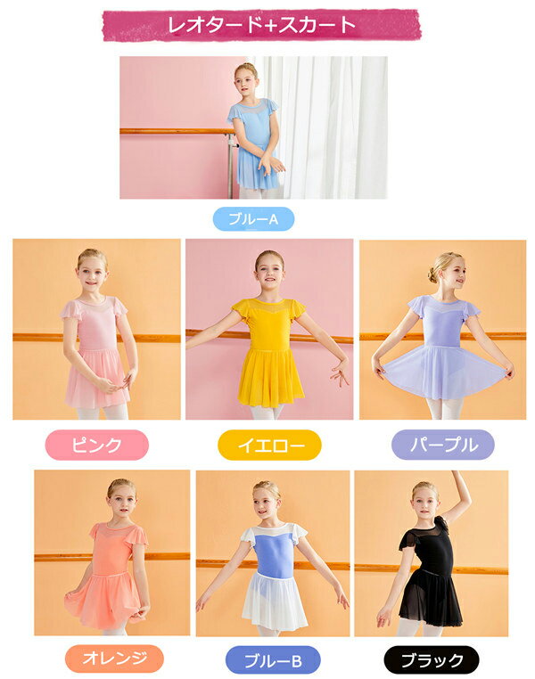 キッズレオタード バレエレオタード 子ども スカート付き チュール 練習着 セットアップ 半袖 透け感 上下セット バレエダンス バレエ レオタード 股下スナップ 女の子 キッズ ジュニア 子供ダンス衣装 オレンジ ブルー ブラック パープル ピンク 110 120 130 140 150 160